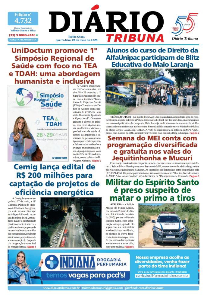 Diário Tribuna, 28 de Maio de 2025, Teófilo Otoni – MG 28/05/2025 0 60 Facebook Twitter Google+ Pinterest WhatsApp Acesse o link abaixo e veja a edição completa do Diário Tribuna desta quarta-feira (28/5/2025) https://diariotribuna.com.br/wp-content/uploads/2025/05/DIARIO-TRIBUNA-55-ANOS-28-MAIO-2025.pdf