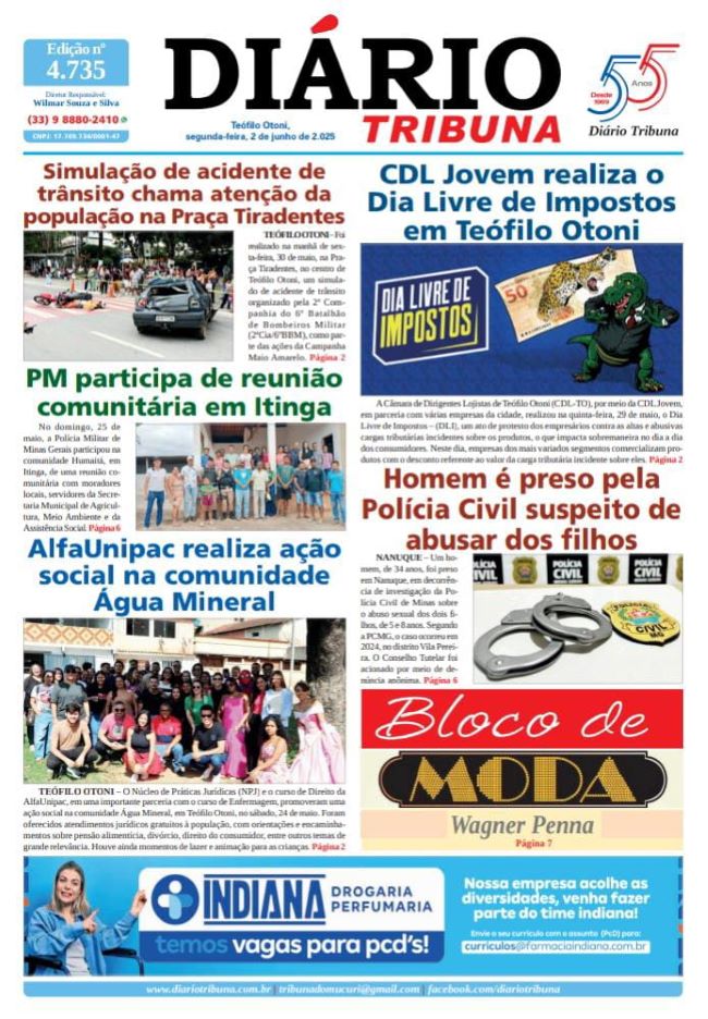 Diário Tribuna, 2 de Junho de 2025, Teófilo Otoni – MG 02/06/2025 0 48 Facebook Twitter Google+ Pinterest WhatsApp Acesse o link abaixo e veja a edição completa do Diário Tribuna desta segunda-feira (2/6/2025) https://diariotribuna.com.br/wp-content/uploads/2025/06/DIARIO-TRIBUNA-55-ANOS-2-JUNHO-2025.pdf