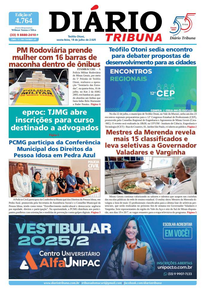 Diário Tribuna, 18 de Julho de 2025, Teófilo Otoni – MG 18/07/2025 0 45 Facebook Twitter Google+ Pinterest WhatsApp Acesse o link abaixo e veja a edição completa do Diário Tribuna desta sexta-feira (18/7/2025) https://diariotribuna.com.br/wp-content/uploads/2025/07/DIARIO-TRIBUNA-55-ANOS-18-JULHO-2025.pdf
