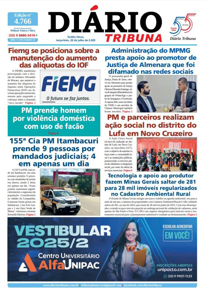 Diário Tribuna, 22 de Julho de 2025, Teófilo Otoni – MG 22/07/2025 0 40 Facebook Twitter Google+ Pinterest WhatsApp Acesse o link abaixo e veja a edição completa do Diário Tribuna desta terça-feira (22/7/2025) https://diariotribuna.com.br/wp-content/uploads/2025/07/DIARIO-TRIBUNA-55-ANOS-22-JULHO-2025.pdf