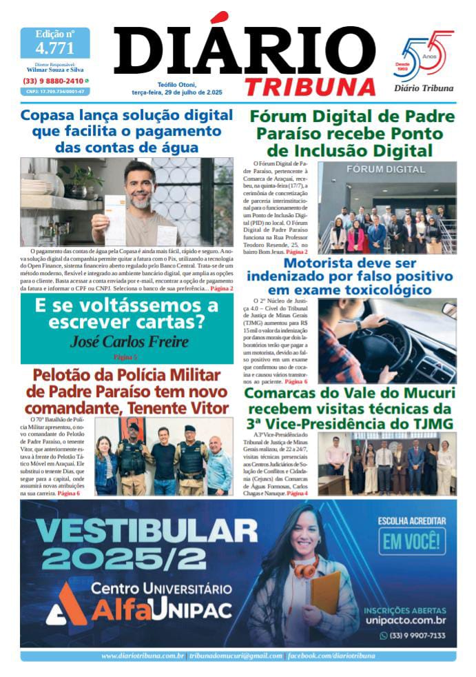 Diário Tribuna, 29 de Julho de 2025, Teófilo Otoni – MG 29/07/2025 0 49 Facebook Twitter Google+ Pinterest WhatsApp Acesse o link abaixo e veja a edição completa do Diário Tribuna desta terça-feira (29/7/2025) https://diariotribuna.com.br/wp-content/uploads/2025/07/DIARIO-TRIBUNA-55-ANOS-29-JULHO-2025.pdf