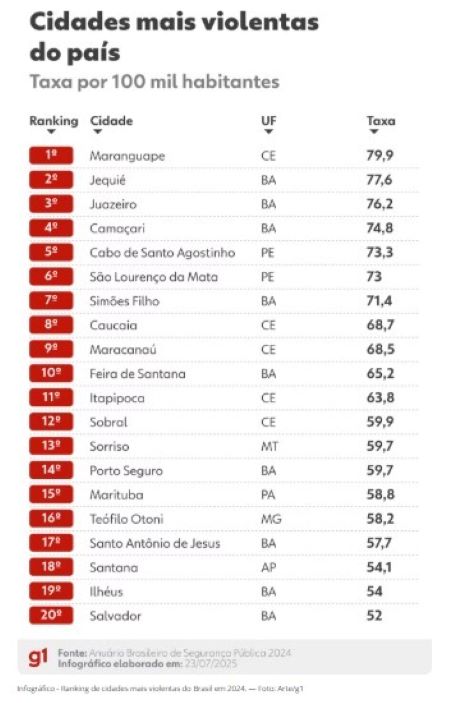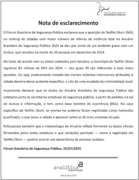 Conforme mencionado na nota de esclarecimento “a aparição de Teófilo Otoni (MG) no ranking de cidades com maior número de vítimas de violência letal no Anuário Brasileiro de Segurança Pública 2025 se deu por conta de um acidente grave com um ônibus, que resultou na morte de 39 pessoas em dezembro de 2024. […] de acordo com os dados coletados pelo Anuário […] praticamente metade das mortes violentas intencionais atribuídas à cidade decorre desse acidente específico, e não de uma escalada da criminalidade local. Importante destacar que os dados do Anuário Brasileiro de Segurança Pública são coletados junto às secretarias estaduais de segurança pública, a partir de pedidos via Lei de Acesso à Informação, e têm como base boletins de ocorrência (BOs). No caso específico de Teófilo Otoni, as mortes no acidente foram registradas como homicídio qualificado, o que levou a cidade a aparecer entre as 20 mais violentas do país”.