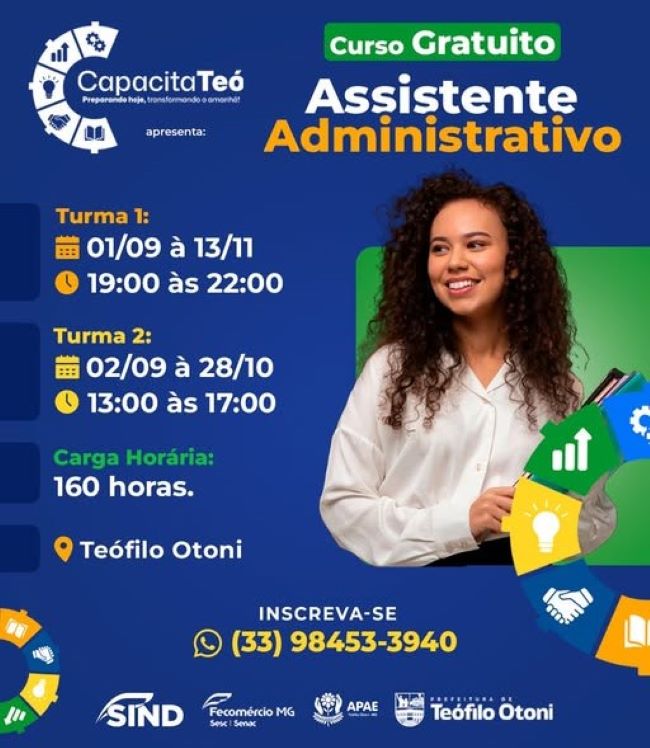 O programa Capacita Teó está trazendo um curso de Assistente Administrativo com duas turmas nesse segundo semestre. Turma 1: de 1º de setembro a 13 de novembro, das 19h às 22h. Turma 2: de 2 de setembro a 28 de outubro, das 13h às 17h. Carga horária: 160 horas