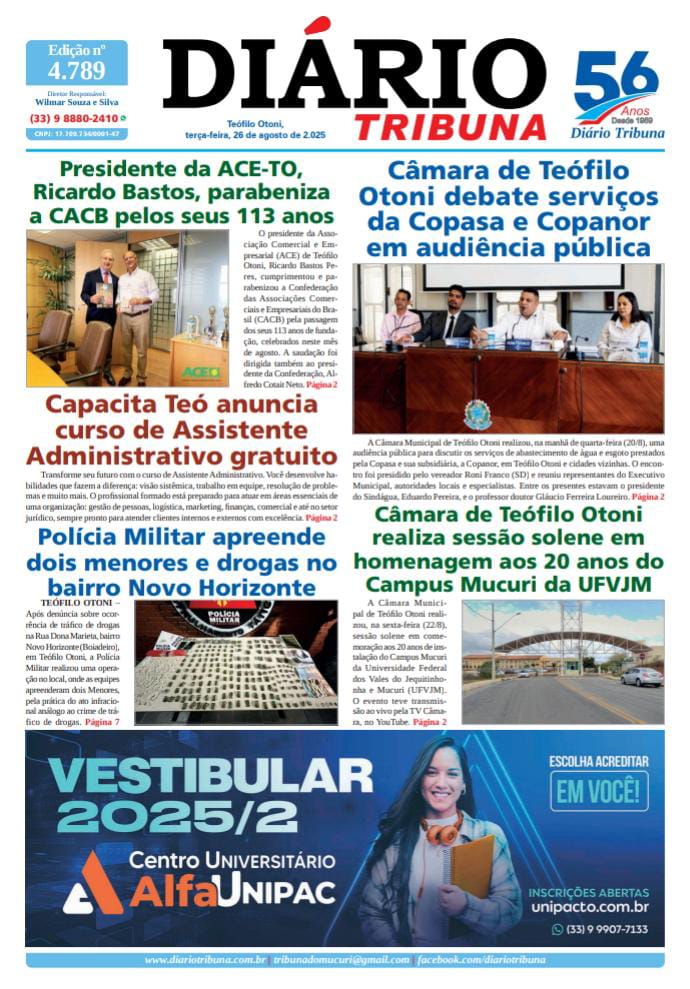 Diário Tribuna, 26 de Agosto de 2025, Teófilo Otoni – MG 26/08/2025 0 41 Facebook Twitter Google+ Pinterest WhatsApp Acesse o link abaixo e veja a edição completa do Diário Tribuna desta terça-feira (26/8/2025) https://diariotribuna.com.br/wp-content/uploads/2025/08/DIARIO-TRIBUNA-56-ANOS-26-AGOSTO-2025.pdf