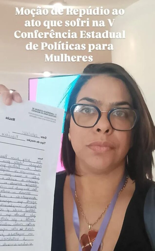 Durante as discussões dos eixos temáticos, a servidora Aivy Ann Roult Macedo, representante de Teófilo Otoni, foi impedida de dar continuidade a uma argumentação e teve sua presença questionada por uma das participantes do respectivo grupo de trabalho. O episódio ocorreu diante de várias mulheres, configurando ato de discriminação e violência contra a delegada do município.