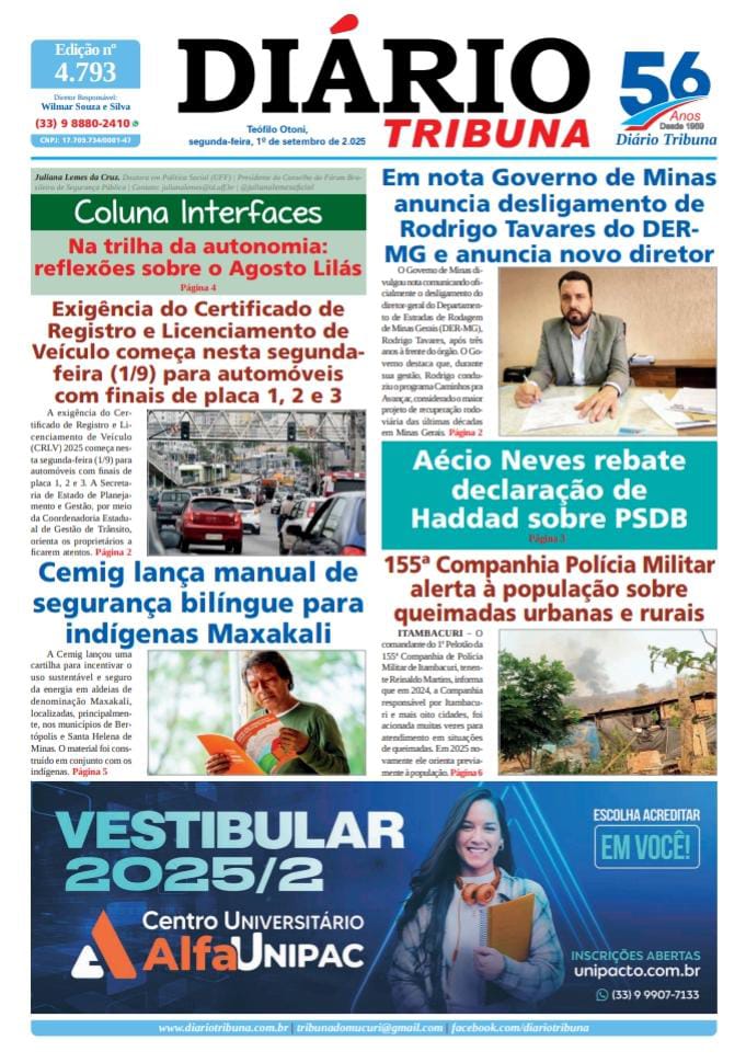 Diário Tribuna, 1º de Setembro de 2025, Teófilo Otoni – MG 01/09/2025 0 37 Facebook Twitter Google+ Pinterest WhatsApp Acesse o link abaixo e veja a edição completa do Diário Tribuna desta segunda-feira (1/9/2025) https://diariotribuna.com.br/wp-content/uploads/2025/09/DIARIO-TRIBUNA-56-ANOS-1-SETEMBRO-2025.pdf