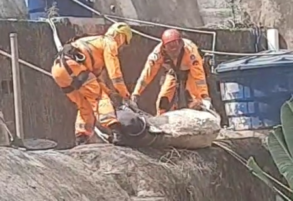 TEÓFILO OTONI – O Corpo de Bombeiros foi acionado na manhã deste domingo (7/9) para resgatar um cavalo que havia escorregado em um lote e ficado preso em um dos patamares da inclinação, a aproximadamente sete metros do solo, no bairro Solidariedade, em Teófilo Otoni, nos fundos de uma residência. A equipe chefiada pelo sargento Christian, foi ao local e usou técnicas para retirar o animal em segurança com a montagem de uma tirolesa.