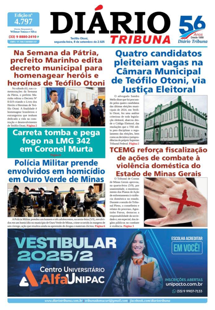 Diário Tribuna, 8 de Setembro de 2025, Teófilo Otoni – MG 08/09/2025 0 41 Facebook Twitter Google+ Pinterest WhatsApp Acesse o link abaixo e veja a edição completa do Diário Tribuna desta segunda-feira (8/9/2025) https://diariotribuna.com.br/wp-content/uploads/2025/09/DIARIO-TRIBUNA-56-ANOS-8-SETEMBRO-2025.pdf