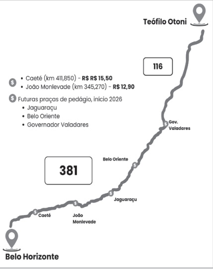 a tarifa reduzida é mantida. Outras três praças de pedágio devem ser implantadas até o início de 2026, nos municípios de Jaguaraçu, Belo Oriente e Governador Valadares. Para os moradores de Teófilo Otoni e dos Vales do Mucuri e Jequitinhonha, a BR-381 é rota habitual para Belo Horizonte — seja para compromissos de saúde, estudo, trabalho ou serviços disponíveis apenas na capital. Com a cobrança, cresce a preocupação com os custos adicionais das viagens regulares. A concessionária afirma que os descontos foram pensados para reduzir o impacto sobre usuários frequentes e que parte