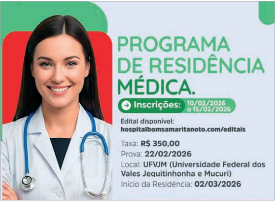 Confira o edital completo em: hospitalbomsamaritanoto.com/ editais – Hospital Bom Samaritano de Teófilo Otoni. Atendimento 100% SUS, onde ciência, tecnologia e educação caminham juntas na formação de especialistas para cuidar de vidas.