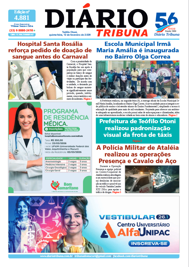 Acesse o link abaixo e veja a edição completa do Diário Tribuna de quinta-feira (12/02/2026):