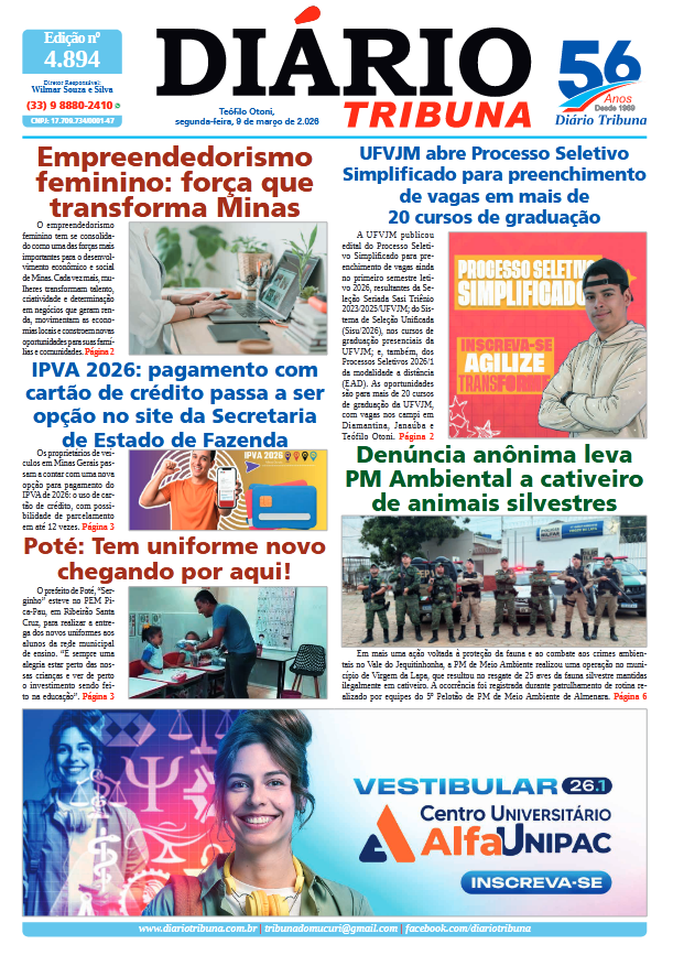Acesse o link abaixo e veja a edição completa do Diário Tribuna de segunda-feira (09/03/2026):