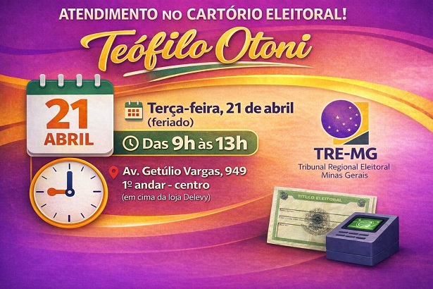 O cartório eleitoral de Teófilo Otoni funcionará em regime especial nesta terça-feira, 21 de abril, feriado nacional. O atendimento será realizado das 9h às 13h.