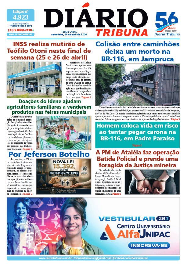 Acesse o link abaixo e veja a edição completa do Diário Tribuna de sexta-feira (24/04/2026):