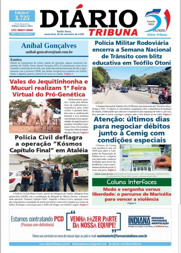 Diário Tribuna, 25 de Setembro 2020, Teófilo Otoni – MG Por diariotribuna - 25/09/2020 0 548 Facebook Twitter Google+ Pinterest WhatsApp Acesse o link abaixo e veja a edição completa do Diário Tribuna desta Sexta-feira (25/09/2020) https://diariotribuna.com.br/wp-content/uploads/2020/09/DIARIO-TRIBUNA-51-ANOS-25-SETEMBRO-2020.pdf