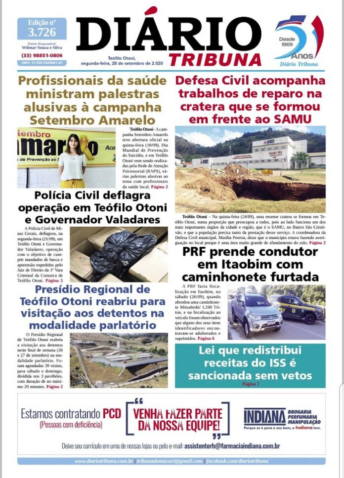 Diário Tribuna, 28 de Setembro 2020, Teófilo Otoni – MG Por diariotribuna - 28/09/2020 0 922 Facebook Twitter Google+ Pinterest WhatsApp Acesse o link abaixo e veja a edição completa do Diário Tribuna desta Segunda-feira (28/09/2020) https://diariotribuna.com.br/wp-content/uploads/2020/09/DIARIO-TRIBUNA-51-ANOS-28-SETEMBRO-2020.pdf