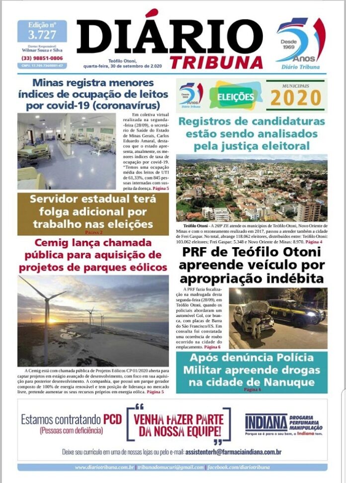 Diário Tribuna, 30 de Setembro 2020, Teófilo Otoni – MG Por diariotribuna - 30/09/2020 0 885 Facebook Twitter Google+ Pinterest WhatsApp Acesse o link abaixo e veja a edição completa do Diário Tribuna desta Quarta-feira (30/09/2020) https://diariotribuna.com.br/wp-content/uploads/2020/09/DIARIO-TRIBUNA-51-ANOS-30-SETEMBRO-2020.pdf