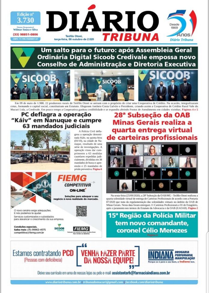 Diário Tribuna, 06 de Outubro 2020, Teófilo Otoni – MG Por diariotribuna - 06/10/2020 0 913 Facebook Twitter Google+ Pinterest WhatsApp Acesse o link abaixo e veja a edição completa do Diário Tribuna desta Terça-feira (06/10/2020) https://diariotribuna.com.br/wp-content/uploads/2020/10/DIARIO-TRIBUNA-50-ANOS-05-OUTUBRO-2020-1.pdf
