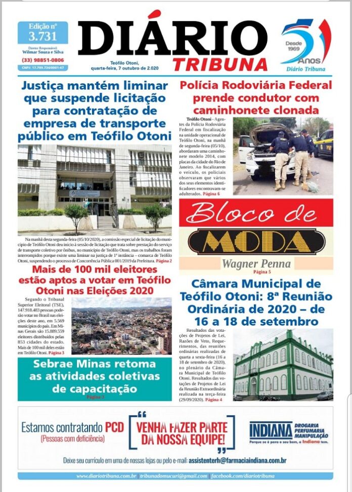 Diário Tribuna, 7 de Outubro 2020, Teófilo Otoni – MG Por diariotribuna - 07/10/2020 0 874 Facebook Twitter Google+ Pinterest WhatsApp Acesse o link abaixo e veja a edição completa do Diário Tribuna desta Quarta-feira (07/10/2020) https://diariotribuna.com.br/wp-content/uploads/2020/10/DIARIO-TRIBUNA-50-ANOS-07-OUTUBRO-2020.pdf