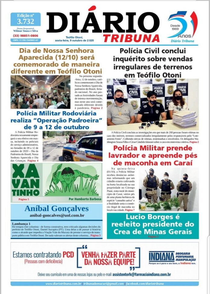 Diário Tribuna, 09 de Outubro 2020, Teófilo Otoni – MG Por diariotribuna - 09/10/2020 0 443 Facebook Twitter Google+ Pinterest WhatsApp Acesse o link abaixo e veja a edição completa do Diário Tribuna desta Sexta-feira (09/10/2020) https://diariotribuna.com.br/wp-content/uploads/2020/10/DIARIO-TRIBUNA-51-ANOS-09-OUTUBRO-2020.pdf