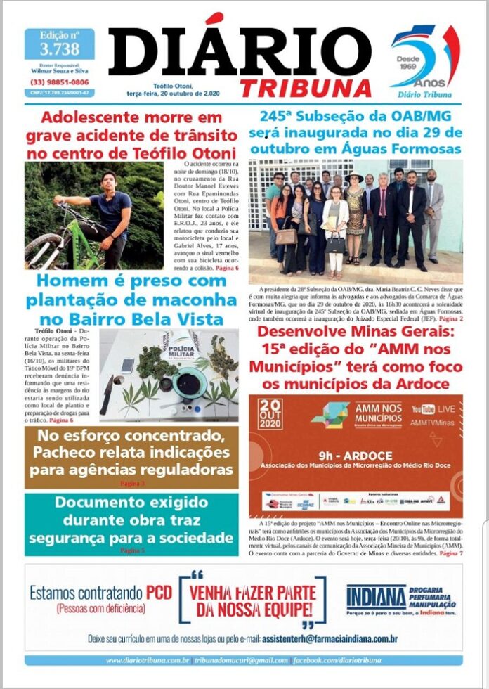 Diário Tribuna, 20 de Outubro 2020, Teófilo Otoni – MG Por diariotribuna - 20/10/2020 0 511 Facebook Twitter Google+ Pinterest WhatsApp Acesse o link abaixo e veja a edição completa do Diário Tribuna desta Terça-feira (20/10/2020) https://diariotribuna.com.br/wp-content/uploads/2020/10/DIARIO-TRIBUNA-51-ANOS-20-OUTUBRO-2020-1.pdf
