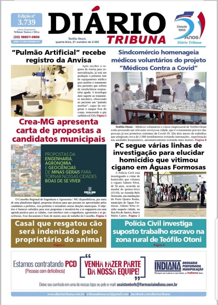 Diário Tribuna, 21 de Outubro 2020, Teófilo Otoni – MG Por diariotribuna - 21/10/2020 0 926 Facebook Twitter Google+ Pinterest WhatsApp Acesse o link abaixo e veja a edição completa do Diário Tribuna desta Quarta-feira (21/10/2020) https://diariotribuna.com.br/wp-content/uploads/2020/10/DIARIO-TRIBUNA-51-ANOS-21-OUTUBRO-2020.pdf