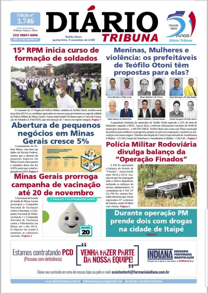 Diário Tribuna, 05 de Novembro 2020, Teófilo Otoni – MG Por diariotribuna - 05/11/2020 0 687 Facebook Twitter Google+ Pinterest WhatsApp Acesse o link abaixo e veja a edição completa do Diário Tribuna desta Quinta-feira (05/11/2020) https://diariotribuna.com.br/wp-content/uploads/2020/11/DIARIO-TRIBUNA-51-ANOS-05-NOVEMBRO-2020.pdf