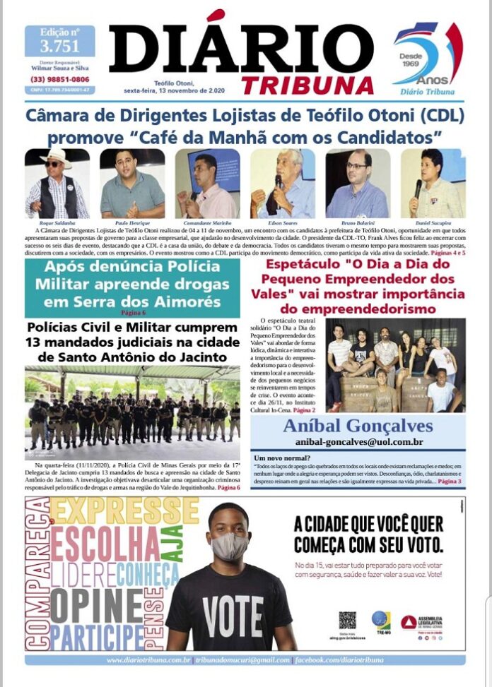 Diário Tribuna, 13 de Novembro 2020, Teófilo Otoni – MG Por diariotribuna - 13/11/2020 0 425 Facebook Twitter Google+ Pinterest WhatsApp Acesse o link abaixo e veja a edição completa do Diário Tribuna desta Sexta-feira (13/11/2020) https://diariotribuna.com.br/wp-content/uploads/2020/11/DIARIO-TRIBUNA-51-ANOS-13-NOVEMBRO-2020.pdf
