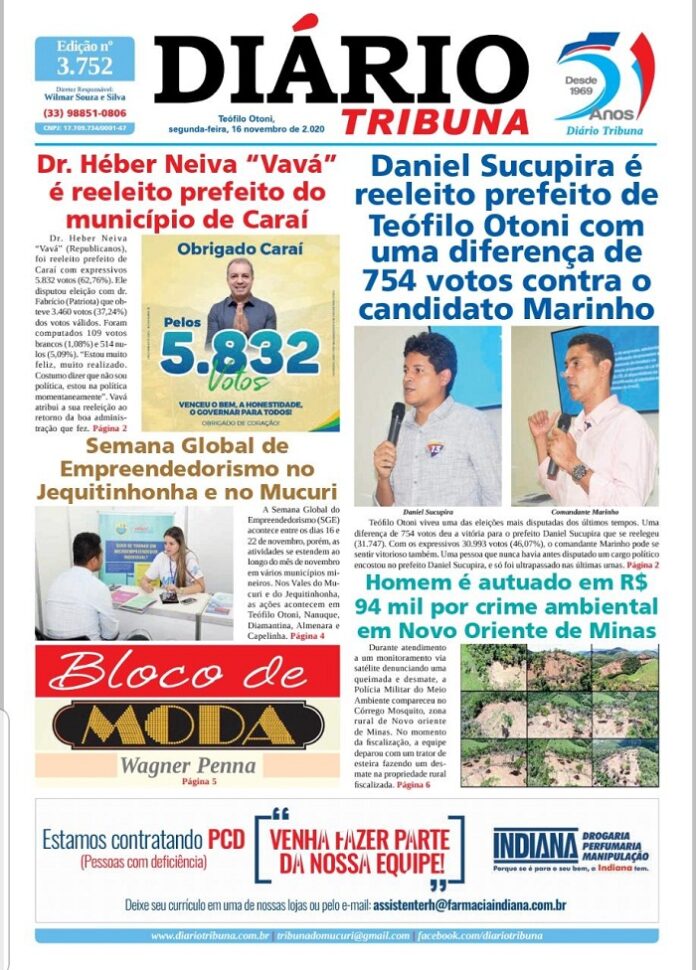 Diário Tribuna, 16 de Novembro 2020, Teófilo Otoni – MG Por diariotribuna - 17/11/2020 0 416 Facebook Twitter Google+ Pinterest WhatsApp Acesse o link abaixo e veja a edição completa do Diário Tribuna desta Segunda-feira (16/11/2020) https://diariotribuna.com.br/wp-content/uploads/2020/11/DIARIO-TRIBUNA-51-ANOS-16-NOVEMBRO-2020.pdf