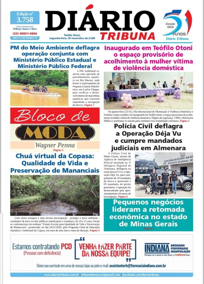 Diário Tribuna, 30 de Novembro 2020, Teófilo Otoni – MG Por diariotribuna - 30/11/2020 0 928 Facebook Twitter Google+ Pinterest WhatsApp Acesse o link abaixo e veja a edição completa do Diário Tribuna desta Segunda-feira (30/11/2020) https://diariotribuna.com.br/wp-content/uploads/2020/11/DIARIO-TRIBUNA-51-ANOS-30-NOVEMBRO-2020.pdf