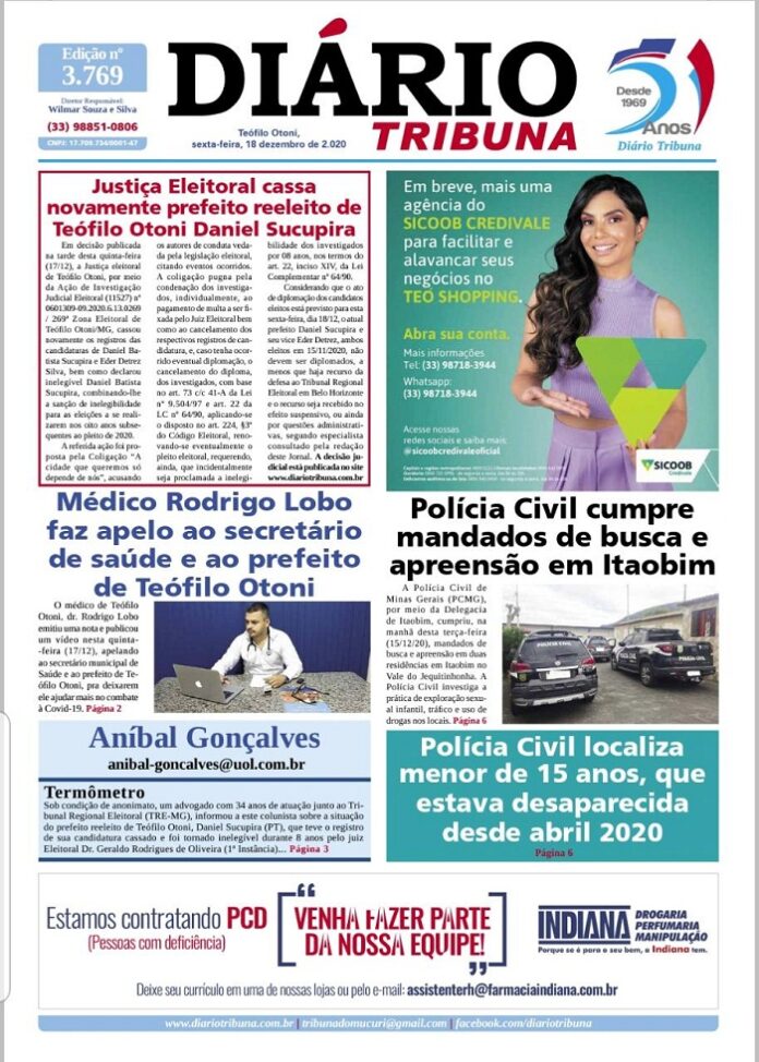 Diário Tribuna, 18 de Dezembro 2020, Teófilo Otoni – MG Por diariotribuna - 18/12/2020 0 1139 Facebook Twitter Google+ Pinterest WhatsApp Acesse o link abaixo e veja a edição completa do Diário Tribuna desta Sexta-feira (18/12/2020) https://diariotribuna.com.br/wp-content/uploads/2020/12/DIARIO-TRIBUNA-51-ANOS-18-DEZEMBRO-2020.pdf