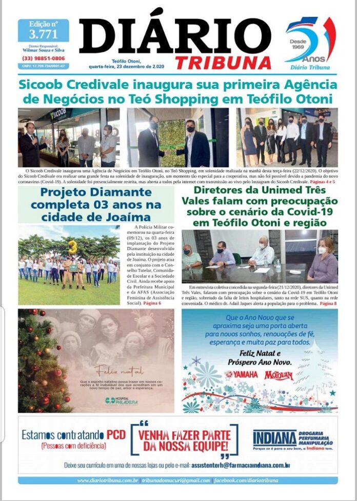 Diário Tribuna, 23 de Dezembro 2020, Teófilo Otoni – MG Por diariotribuna - 23/12/2020 0 503 Facebook Twitter Google+ Pinterest WhatsApp Acesse o link abaixo e veja a edição completa do Diário Tribuna desta Quarta-feira (23/12/2020) https://diariotribuna.com.br/wp-content/uploads/2020/12/DIARIO-TRIBUNA-50-ANOS-23-DEZEMBRO-2020.pdf