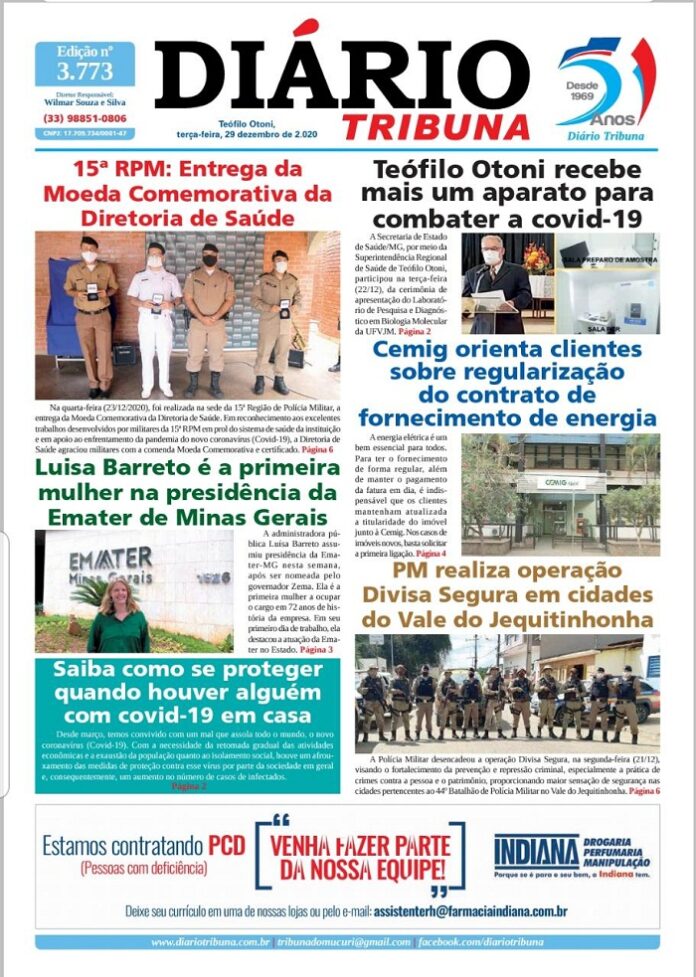 Diário Tribuna, 29 de Dezembro 2020, Teófilo Otoni – MG Por diariotribuna - 29/12/2020 0 887 Facebook Twitter Google+ Pinterest WhatsApp Acesse o link abaixo e veja a edição completa do Diário Tribuna desta Terça-feira (29/12/2020) https://diariotribuna.com.br/wp-content/uploads/2020/12/DIARIO-TRIBUNA-51-ANOS-29-DEZEMBRO-2020.pdf