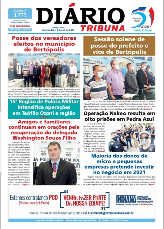 Diário Tribuna, 04 de Janeiro 2021, Teófilo Otoni/MG Por diariotribuna - 04/01/2021 0 736 Facebook Twitter Google+ Pinterest WhatsApp Acesse o link abaixo e veja a edição completa do Diário Tribuna desta Segunda-feira (04/01/2021) https://diariotribuna.com.br/wp-content/uploads/2021/01/DIARIO-TRIBUNA-51-ANOS-04-JANEIRO-2021.pdf