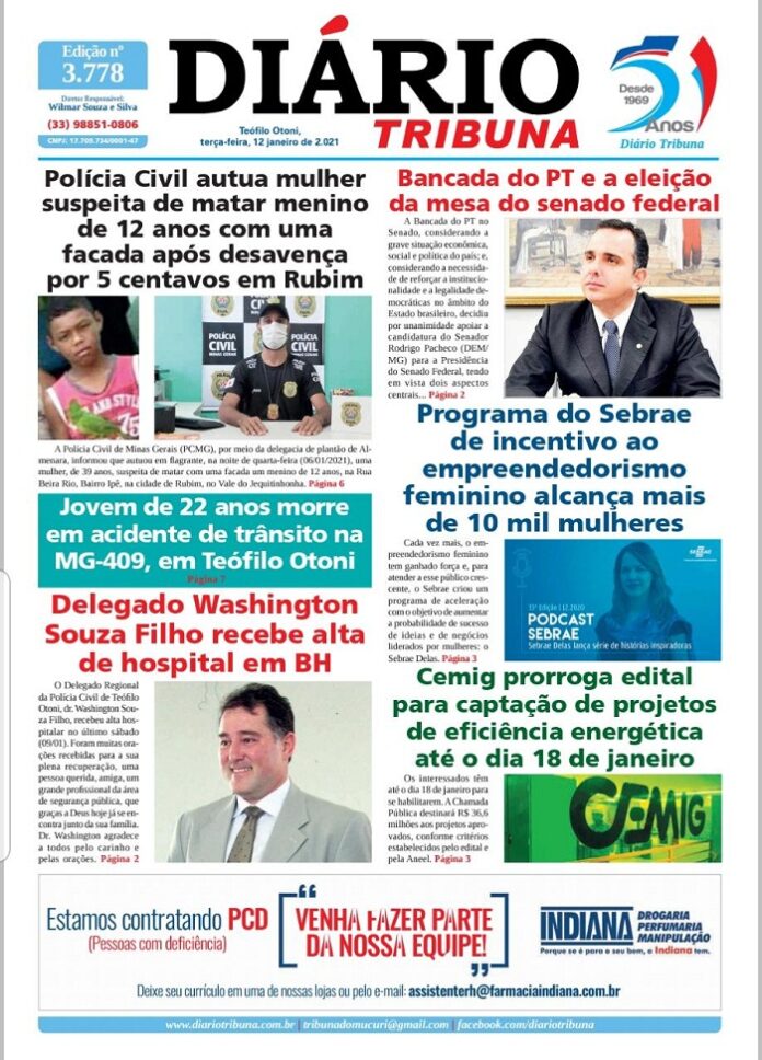 Diário Tribuna, 12 de Janeiro 2021, Teófilo Otoni/MG Por diariotribuna - 12/01/2021 0 461 Facebook Twitter Google+ Pinterest WhatsApp Acesse o link abaixo e veja a edição completa do Diário Tribuna desta Terça-feira (12/01/2021) https://diariotribuna.com.br/wp-content/uploads/2021/01/DIARIO-TRIBUNA-51-ANOS-12-JANEIRO-2021.pdf
