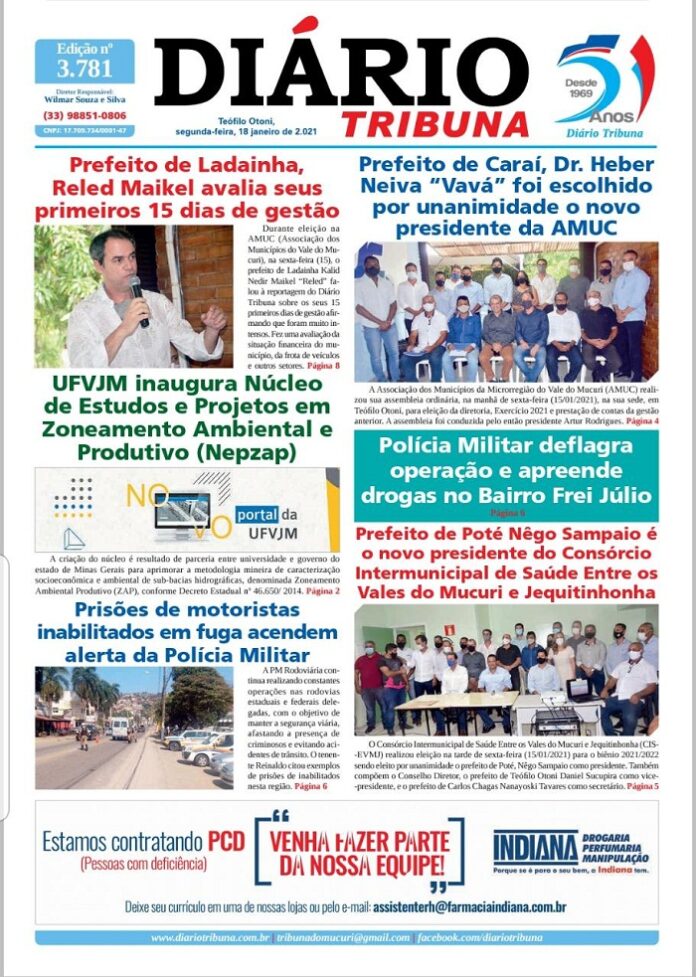 Diário Tribuna, 18 de Janeiro 2021, Teófilo Otoni/MG Por diariotribuna - 18/01/2021 0 523 Facebook Twitter Google+ Pinterest WhatsApp Acesse o link abaixo e veja a edição completa do Diário Tribuna desta Segunda-feira (18/01/2021) https://diariotribuna.com.br/wp-content/uploads/2021/01/DIARIO-TRIBUNA-51-ANOS-18-JANEIRO-2021.pdf