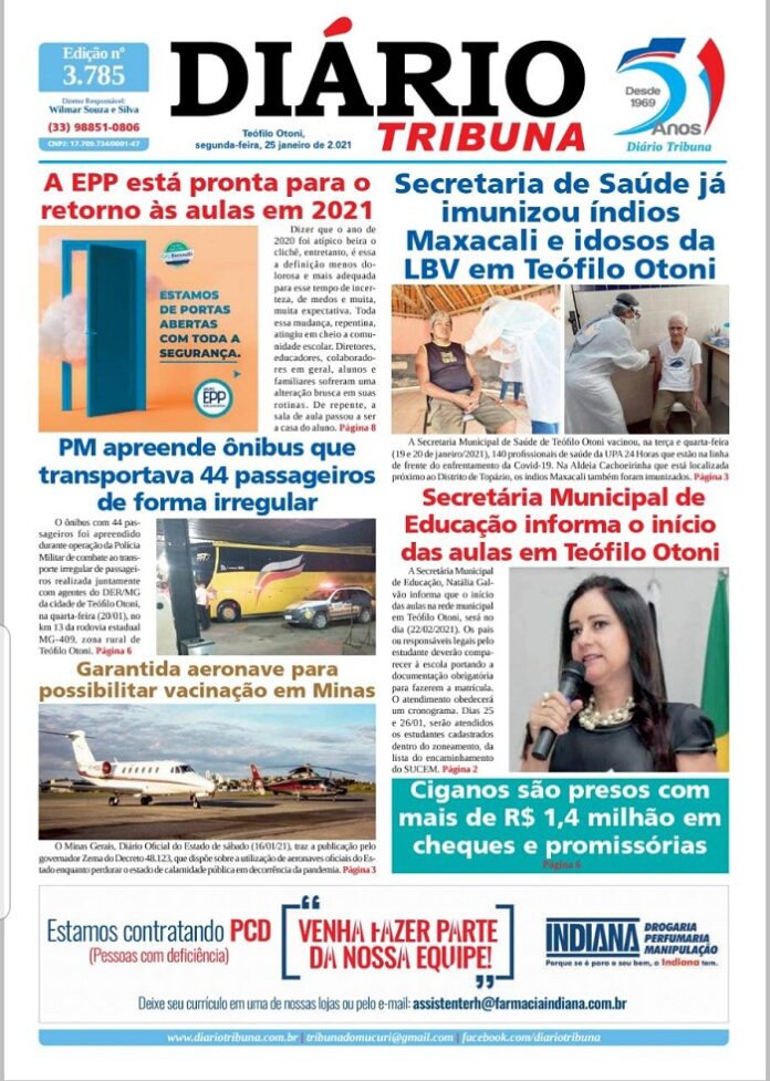 Diário Tribuna, 25 de Janeiro 2021, Teófilo Otoni/MG Por diariotribuna - 25/01/2021 0 788 Facebook Twitter Google+ Pinterest WhatsApp Acesse o link abaixo e veja a edição completa do Diário Tribuna desta Segunda-feira (25/01/2021) https://diariotribuna.com.br/wp-content/uploads/2021/01/DIARIO-TRIBUNA-51-ANOS-25-JANEIRO-2021.pdf