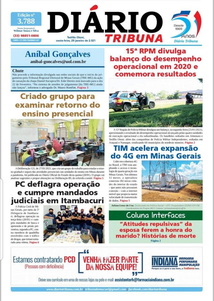 Diário Tribuna, 29 de Janeiro 2021, Teófilo Otoni/MG Por diariotribuna - 29/01/2021 0 946 Facebook Twitter Google+ Pinterest WhatsApp Acesse o link abaixo e veja a edição completa do Diário Tribuna desta Sexta-feira (29/01/2021) https://diariotribuna.com.br/wp-content/uploads/2021/01/DIARIO-TRIBUNA-51-ANOS-29-JANEIRO-2021.pdf