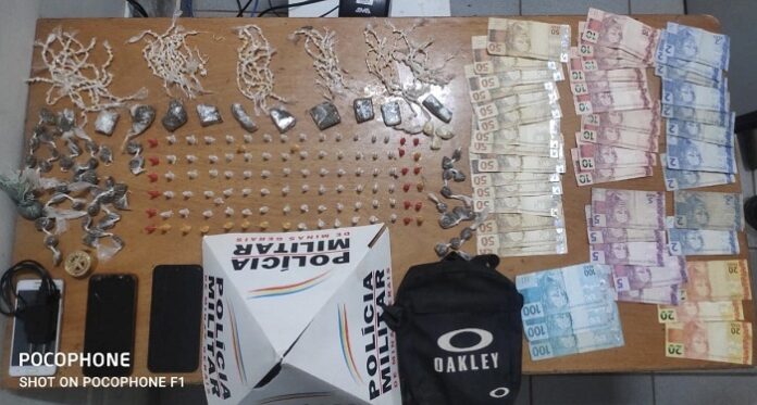 Durante busca pessoal foi encontrado e apreendido com ele, 482 pedras mais 04 porções de crack, 11 tabletes mais 52 buchas de maconha, 98 pinos com cocaína e 01 pino vazio, 01 dichavador, 03 aparelhos celulares, 01 carregador de celular, 01 pochete e a importância de R$ 945. O condutor que é menor de idade foi apreendido por ato infracional análogo ao tráfico de drogas. (Informações/Foto: Assessoria de comunicação organizacional da 24ª Cia PM Ind, Nanuque).