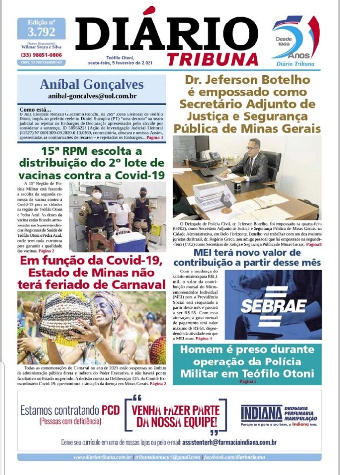 Diário Tribuna, 5 de Fevereiro 2021, Teófilo Otoni/MG Por diariotribuna - 05/02/2021 0 1223 Facebook Twitter Google+ Pinterest WhatsApp Acesse o link abaixo e veja a edição completa do Diário Tribuna desta Sexta-feira (05/02/2021) https://diariotribuna.com.br/wp-content/uploads/2021/02/DIARIO-TRIBUNA-51-ANOS-05-FEVEREIRO-2021.pdf