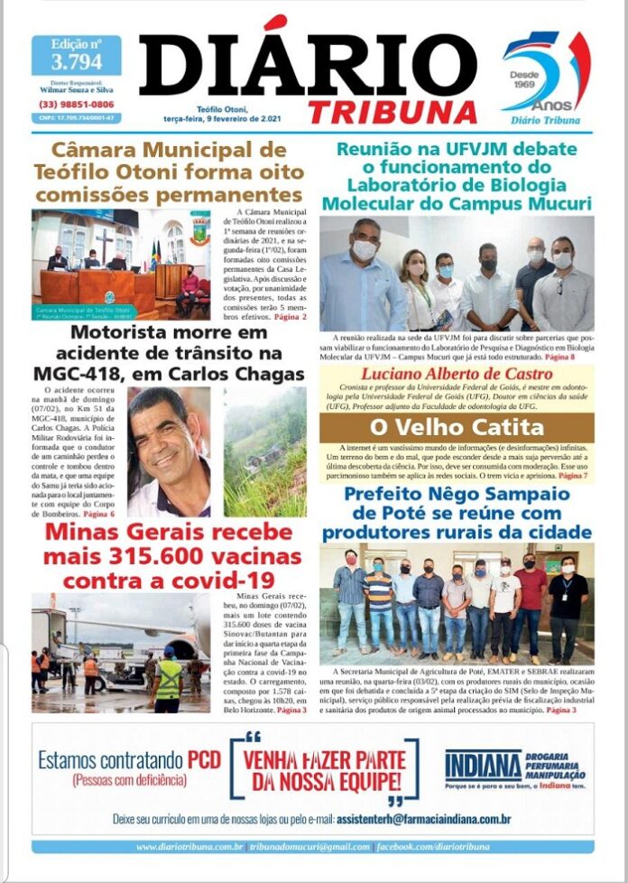 Diário Tribuna, 9 de Fevereiro 2021, Teófilo Otoni/MG Por diariotribuna - 09/02/2021 0 1079 Facebook Twitter Google+ Pinterest WhatsApp Acesse o link abaixo e veja a edição completa do Diário Tribuna desta Terça-feira (09/02/2021) https://diariotribuna.com.br/wp-content/uploads/2021/02/DIARIO-TRIBUNA-51-ANOS-09-FEVEREIRO-2021.pdf