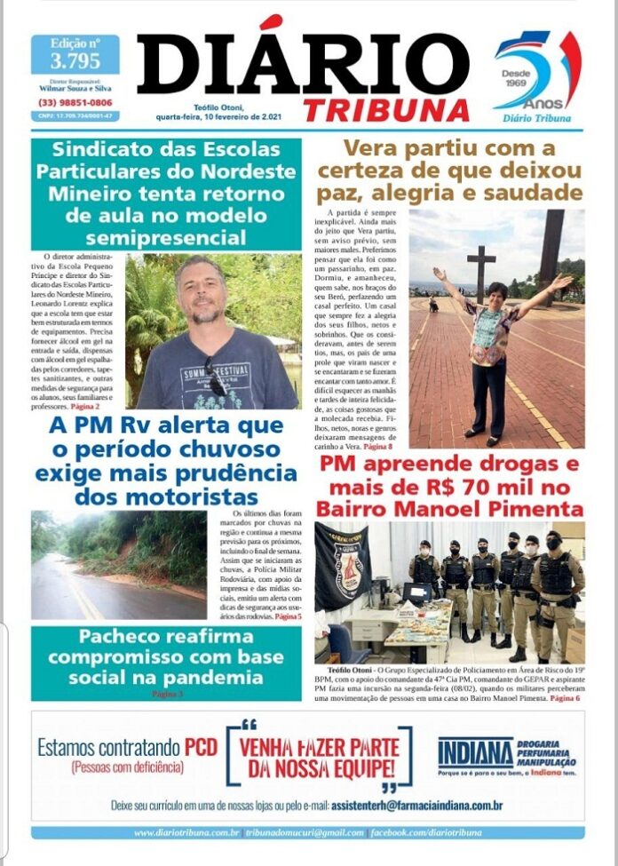 Diário Tribuna, 10 de Fevereiro de 2021, Teófilo Otoni/MG Por diariotribuna - 10/02/2021 0 1358 Facebook Twitter Google+ Pinterest WhatsApp Acesse o link abaixo e veja a edição completa do Diário Tribuna desta Quarta-feira (10/02/2021) https://diariotribuna.com.br/wp-content/uploads/2021/02/DIARIO-TRIBUNA-51-ANOS-10-FEVEREIRO-2021.pdf