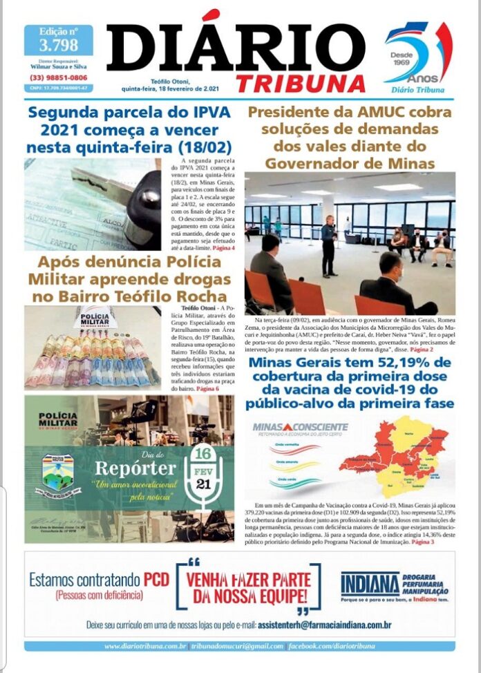 Diário Tribuna, 18 de Fevereiro 2021, Teófilo Otoni/MG Por diariotribuna - 18/02/2021 0 895 Facebook Twitter Google+ Pinterest WhatsApp Acesse o link abaixo e veja a edição completa do Diário Tribuna desta Quinta-feira (18/02/2021) https://diariotribuna.com.br/wp-content/uploads/2021/02/DIARIO-TRIBUNA-51-ANOS-18-FEVEREIRO-2021.pdf