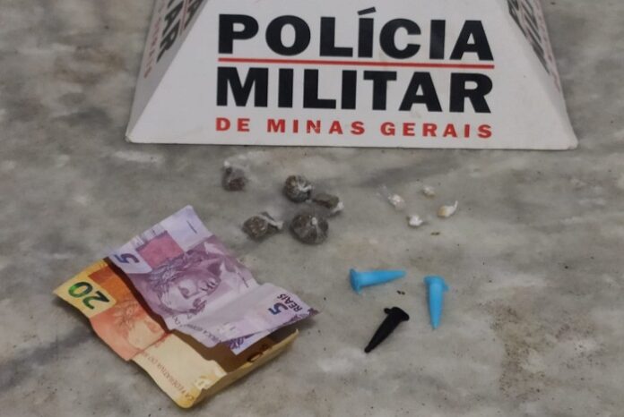 O menor foi abordado e submetido a busca pessoal, sendo localizado na sua bolsa a tiracolo 03 pinos com cocaína, 05 buchas de maconha, 05 pedras de crack e R$ 25,00. Ele foi apreendido pelo ato infracional aná logo ao crime de tráfico de drogas e conduzido à delegacia de Polícia Civil em Almenara junto com os materiais apreendidos. Equipe PM: sargento Lemos e cabo Leandro.
