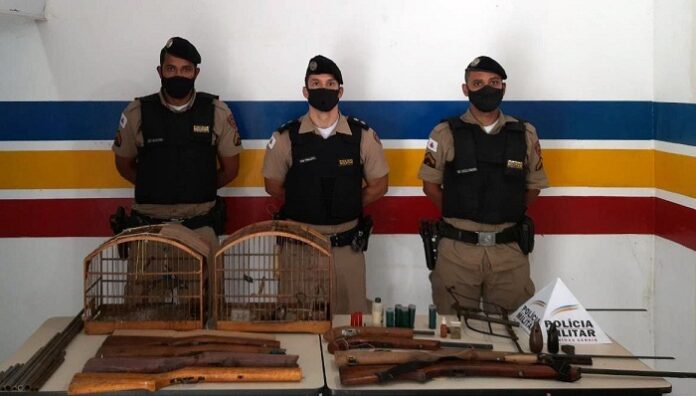 Materiais apreendidos: No fundos do imóvel do morador, havia uma oficina de fabricação de armamento, sendo localizadas 04 armas de fogo, 05 coronhas, 11 canos de espingarda/garrucha, além de materiais para recarga, armadilha de animais e dois pássaros da fauna silvestre brasileira da espécie trinca-ferro.