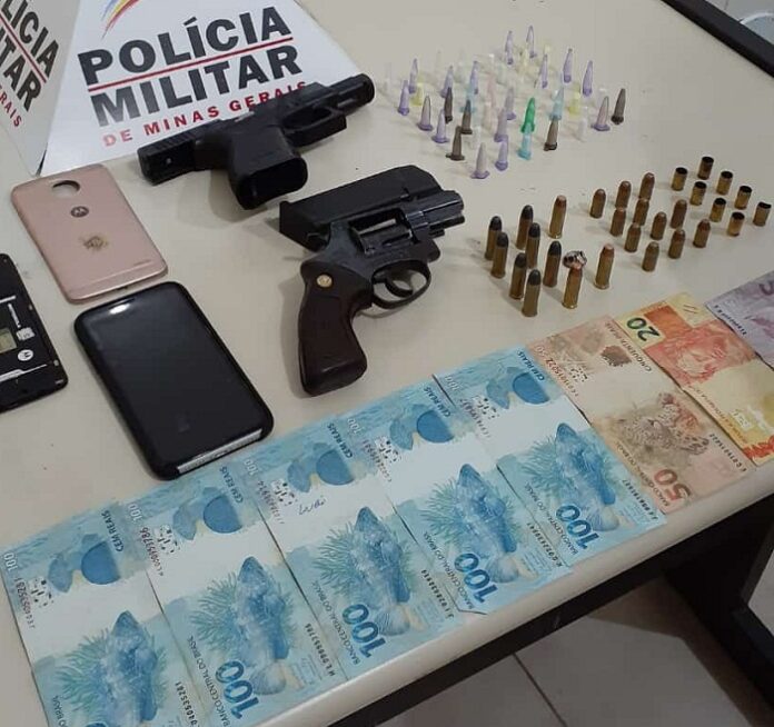 Dentro do veículo foram localizadas duas armas de fogo, uma pistola Glock 380 carregada com 11 cartuchos e um revólver calibre 38 carregado com 05 cartuchos, que o autor (carona) assumiu a posse das referidas armas. Com ele ainda foi apreendido a quantia de R$575,00 mais cinco munições calibre 38 e celulares. Os dois foram conduzidos à delegacia de Polícia Civil para ratificação do flagrante.