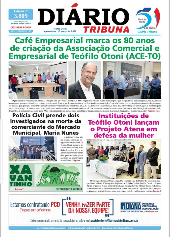 Diário Tribuna, 10 de Março 2021, Teófilo Otoni/MG Por diariotribuna - 10/03/2021 0 599 Facebook Twitter Google+ Pinterest WhatsApp Acesse o link abaixo e veja a edição completa do Diário Tribuna desta Quarta-feira (10/3/2021) https://diariotribuna.com.br/wp-content/uploads/2021/03/DIARIO-TRIBUNA-51-ANOS-10-MARCO-2021.pdf