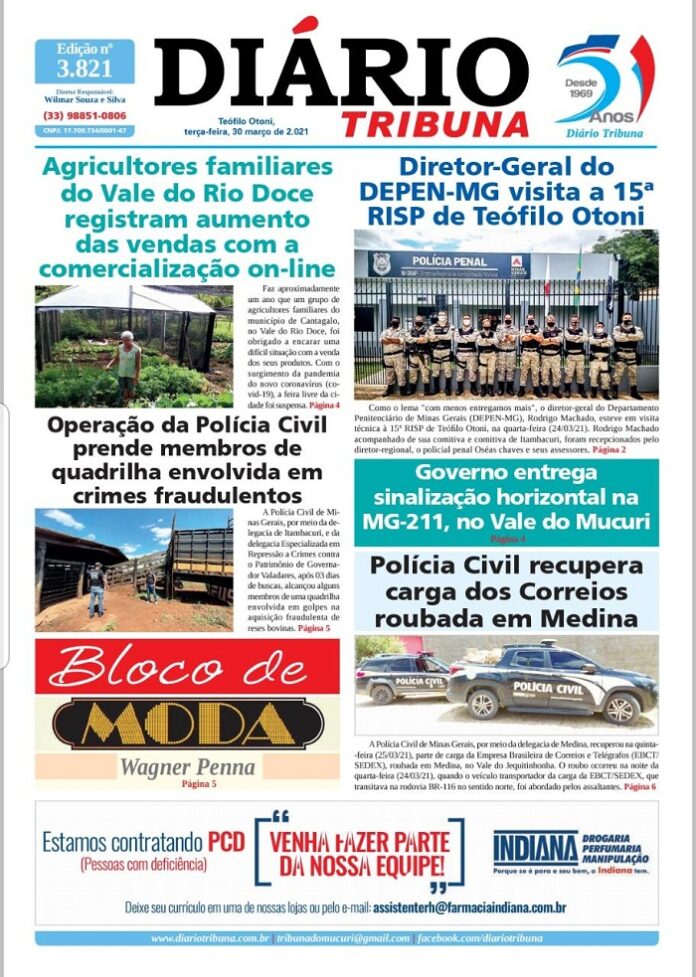 Diário Tribuna, 30 de Março 2021, Teófilo Otoni – MG Por diariotribuna - 30/03/2021 0 774 Facebook Twitter Google+ Pinterest WhatsApp Acesse o link abaixo e veja a edição completa do Diário Tribuna desta Terça-feira (30/03/2021) https://diariotribuna.com.br/wp-content/uploads/2021/03/DIARIO-TRIBUNA-51-ANOS-30-MARCO-2021.pdf