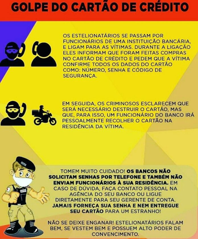 A assessoria de comunicação organizacional do 19º Batalhão de Polícia Militar alerta à população para ficar atenta quanto aos golpes do cartão de crédito que têm ocorrido com maior frequência em Teófilo Otoni e região.
