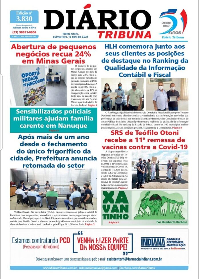 Diário Tribuna, 15 de Abril 2021, Teófilo Otoni – MG Por diariotribuna - 15/04/2021 0 632 Facebook Twitter Google+ Pinterest WhatsApp Acesse o link abaixo e veja a edição completa do Diário Tribuna desta Quinta-feira (15/04/2021) https://diariotribuna.com.br/wp-content/uploads/2021/04/DIARIO-TRIBUNA-51-ANOS-15-ABRIL-2021.pdf